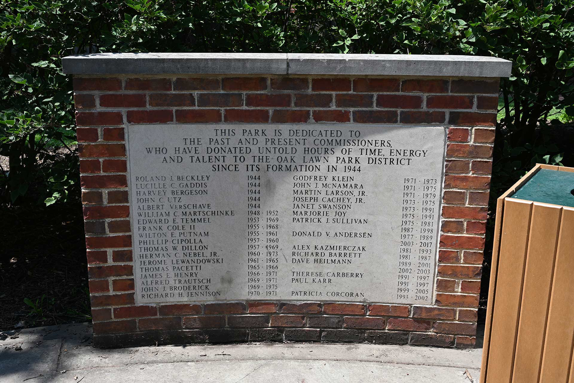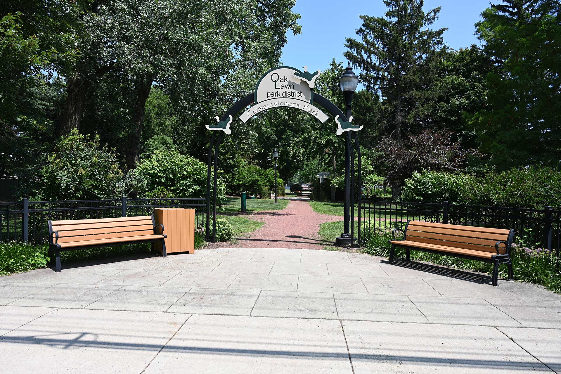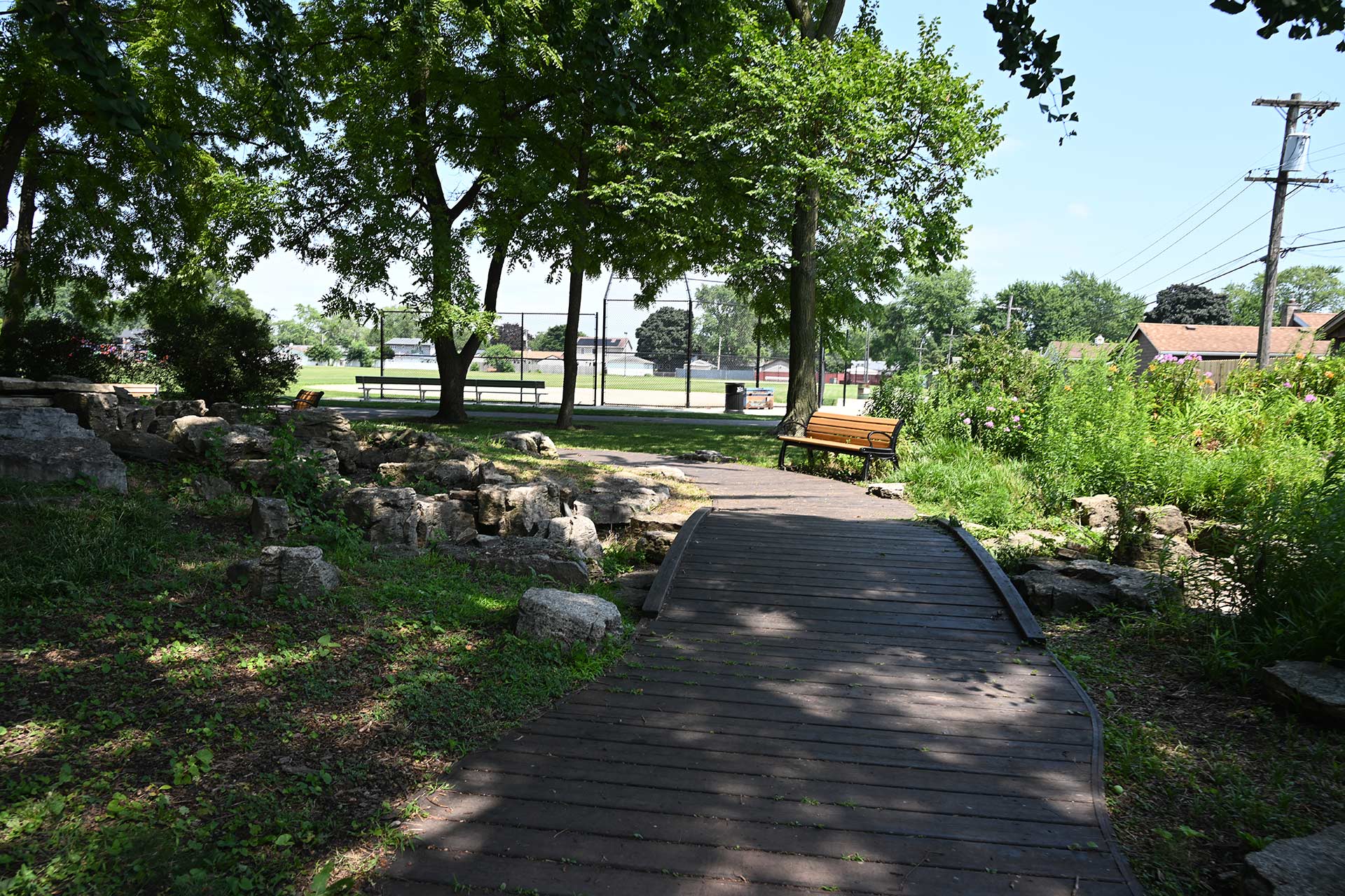 The park includes a cascading waterfall feature, walking path, floral gardens, sculptured art wall, and a wide variety of shade trees.