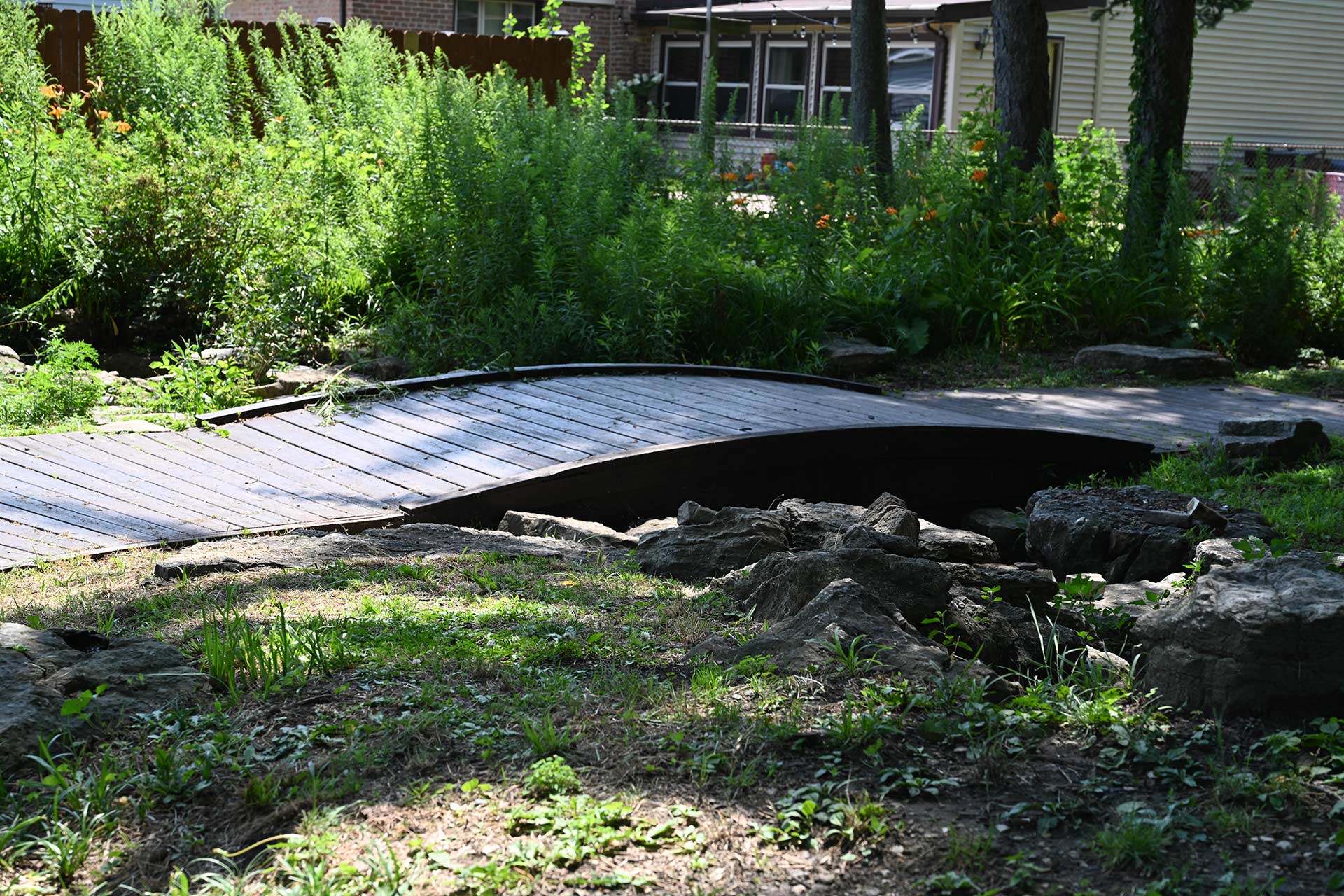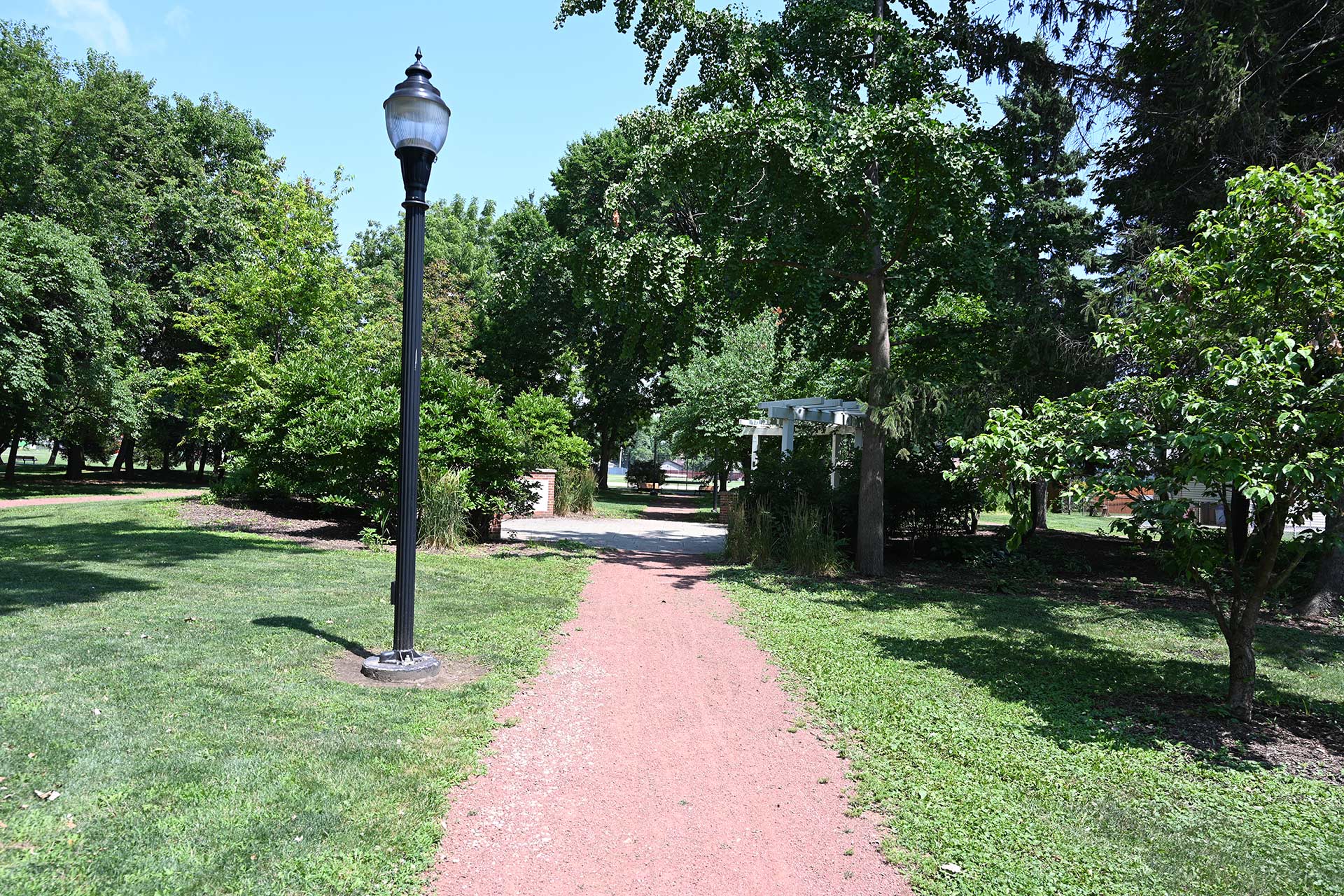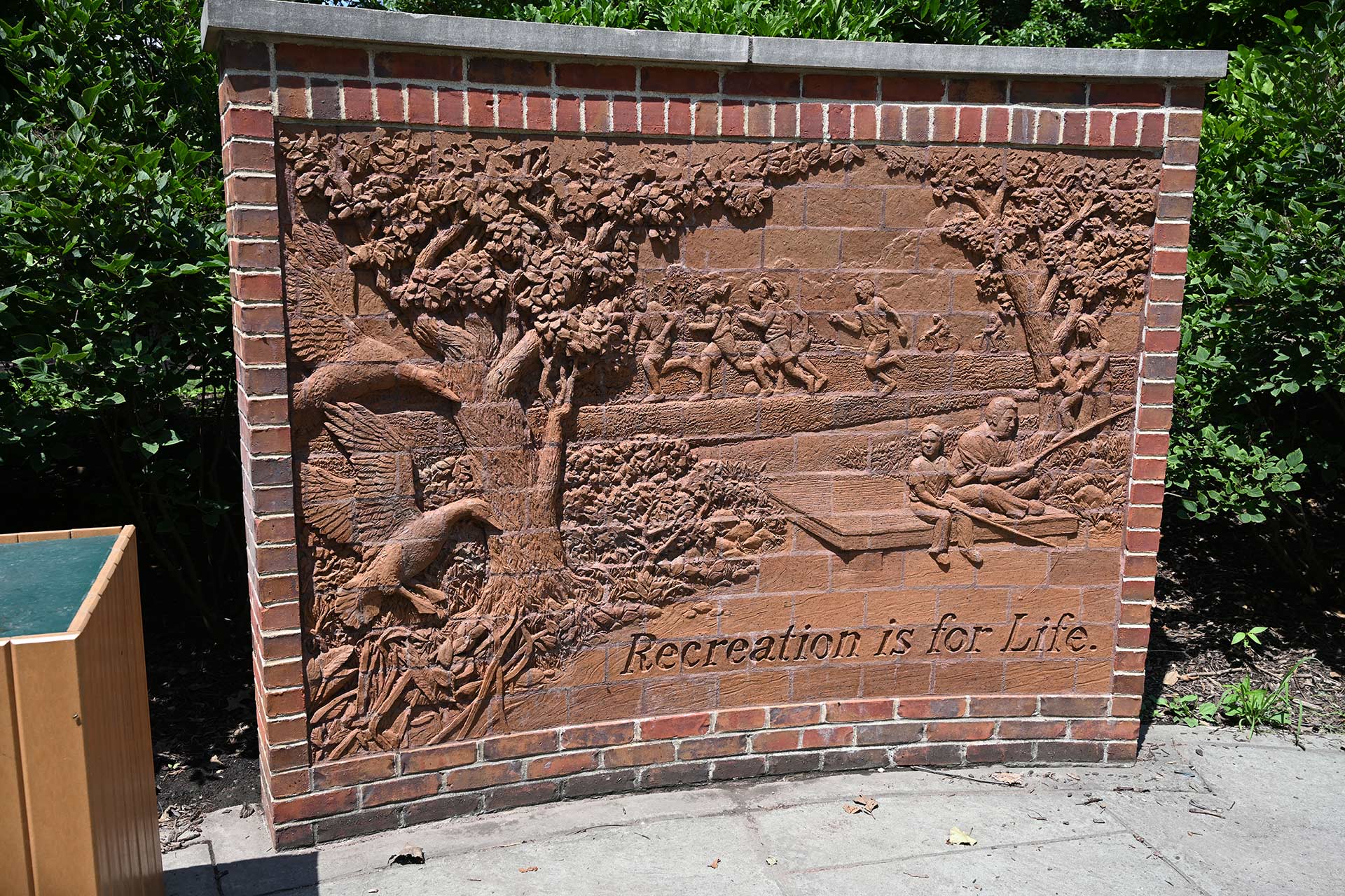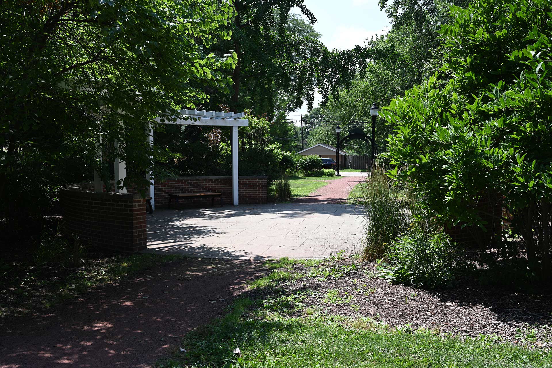 The park includes a cascading waterfall feature, walking path, floral gardens, sculptured art wall, and a wide variety of shade trees.